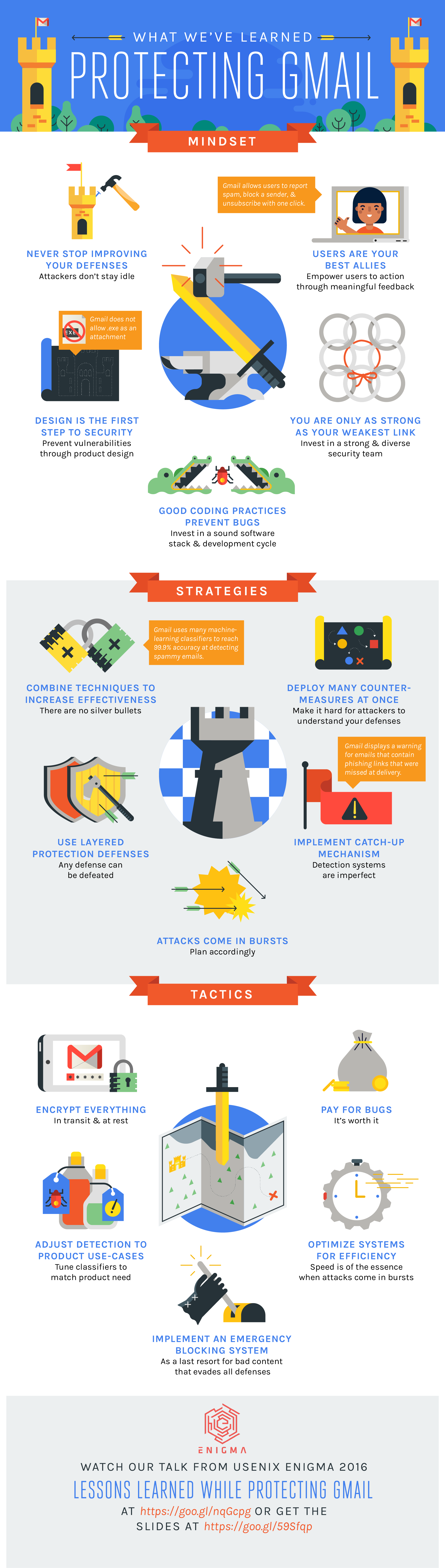 Tactics: These lessons are focused on a specific aspect of security and how to deal with it. For example, the tactic pay for bugs is our playbook response on how to deal with external reports: we not only welcome them but encourage them through financial rewards because they are very helpful in making Gmail more secure.